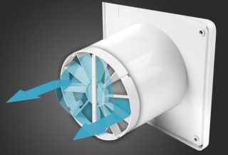 Ventilateurs axiaux - roue à aubes dans un boîtier avec un moteur qui l'entraîne. Lors de la rotation, les pales inclinées vers l'intérieur aspirent de l'air et le déplacent le long de l'axe. De tels appareils sont les plus populaires pour les salles de bains dans les appartements. Les appareils se distinguent par leur design, leur prix abordable et leur facilité d'installation. Ils sont installés sur un mur dans un puits de ventilation. Les modèles de type axial se caractérisent par une efficacité et une productivité élevées. Les hottes sont fabriquées à la fois jusqu'à 100 mètres cubes par heure et avec une puissance plus élevée. Plus la valeur de performance est élevée, plus le diamètre d'ouverture du ventilateur est grand. Avantages:
