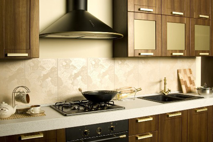 Les poêles de la cuisine peuvent être de différentes largeurs, aujourd'hui des modèles de 60 à 90 cm sont présentés.Une cuisinière à gaz ou électrique doit être légèrement recouverte d'une hotte aspirante. Cela garantit une capture complète de l'air pollué et sa purification ou son évacuation vers l'extérieur.