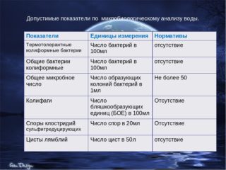 Lors de l'évaluation de l'état du liquide, la teneur totale en impuretés étrangères et en bactéries est calculée.La concentration de bactéries coliformes déterminera si une telle eau est généralement utilisable.