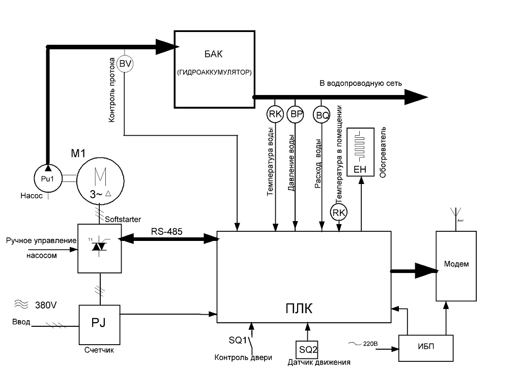 Chaque système automatisé d'approvisionnement en eau et d'assainissement est équipé d'un programme de contrôle. En conséquence, les pompes fonctionnent sans la présence d'une personne, maintenant la bonne quantité d'eau dans les réservoirs. Ils fournissent une pression prédéterminée dans les conduites d'eau. Le schéma fonctionne efficacement lorsqu'une pompe est le leader, les autres sont des esclaves. Après un certain temps, la pompe principale est changée, cela évite une usure prématurée de l'équipement. Le contrôleur automatisé du système d'eau compte le nombre d'heures de fonctionnement de chaque pompe.