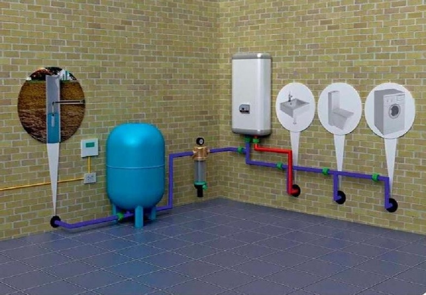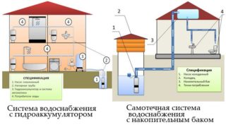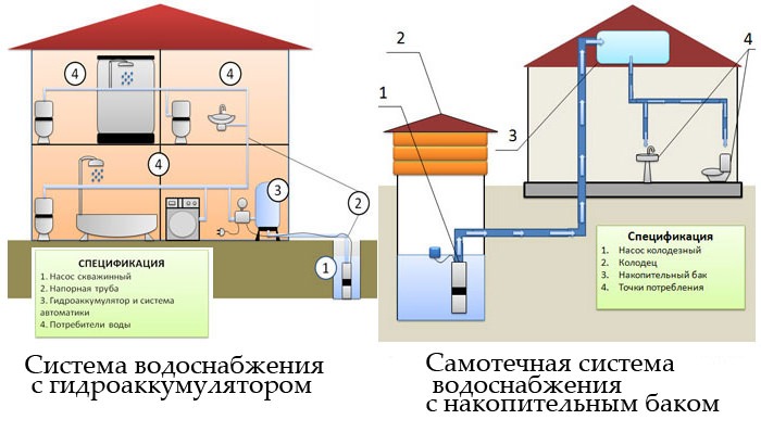 La plomberie privée peut être à un ou deux niveaux. Le principe de fonctionnement du premier est que l'eau d'un puits ou d'un puits est utilisée immédiatement après le pompage. La différence entre la seconde est l'utilisation de réservoirs qui créent un approvisionnement en eau. Ils sont cylindriques ou prismatiques d'un volume de 560 à 4500 litres, en polyéthylène ou en polychlorure de vinyle.
