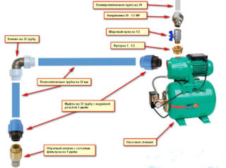 - Selon le schéma, une installation indépendante d'un réservoir hydraulique avec un pressostat et d'autres dispositifs nécessaires est réalisée dans la maison. Les appareils sont connectés au réseau électrique et entre eux.