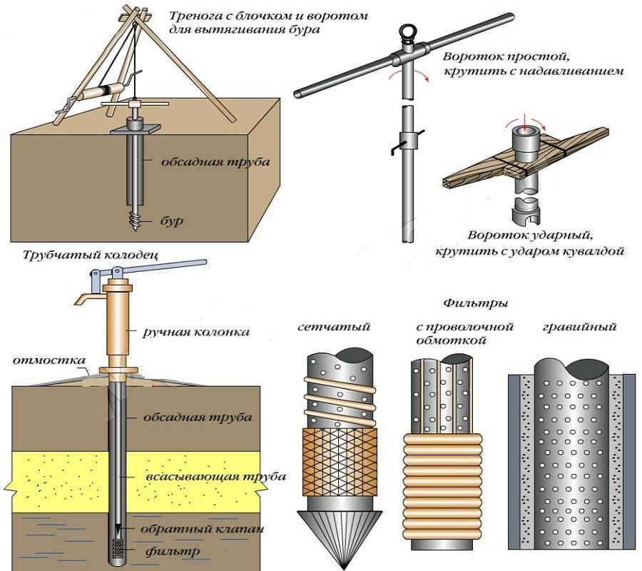 À partir d'un outil de forage domestique (non professionnel), une tarière de jardin, un manchon en acier à bords tranchants ou un voleur (manchon avec des lames intérieures) sont utilisés. Un treuil tripode sert de mécanisme de levage.