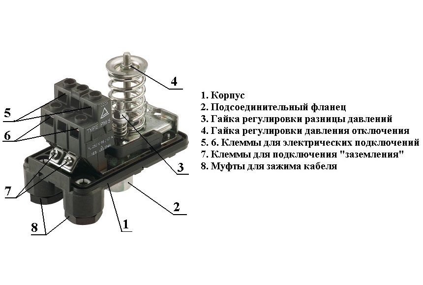 Le relais est un dispositif électromécanique du type le plus simple, à l'intérieur duquel une membrane sensible est installée. Il réagit à la pression à l'intérieur du réseau d'alimentation en eau. Le dispositif de marche à sec lui-même est installé après la pompe, reliant les deux avec un raccord de tuyauterie.