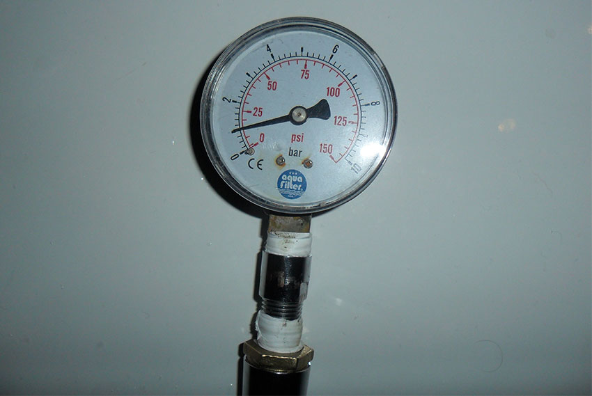 La deuxième façon consiste à connecter un manomètre conventionnel à l'un des consommateurs. Pour ce faire, vous devez utiliser un adaptateur qui se connecte, par exemple, au même mélangeur dans la cuisine ou à une pomme de douche.