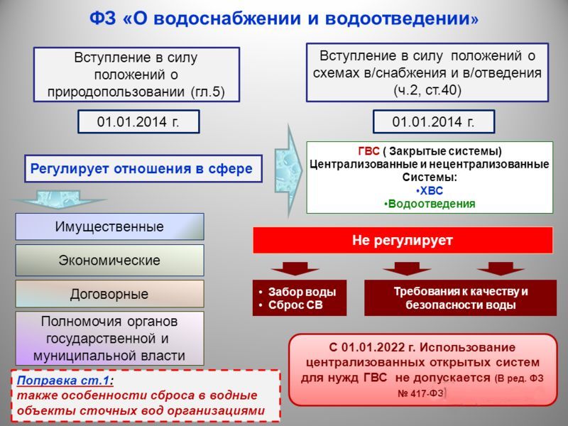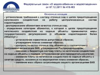 Une autre condition importante est le paiement et les tarifs. Un mois civil est la période de déclaration. La tarification est effectuée séparément : pour l'eau potable ou industrielle, ou pour la totalité du volume de liquide consommé. Les tarifs sont fixés conformément aux dispositions de la loi fédérale intitulée « sur l'approvisionnement en eau et l'évacuation des eaux usées ». Souvent, la tarification est effectuée selon d'autres réglementations.