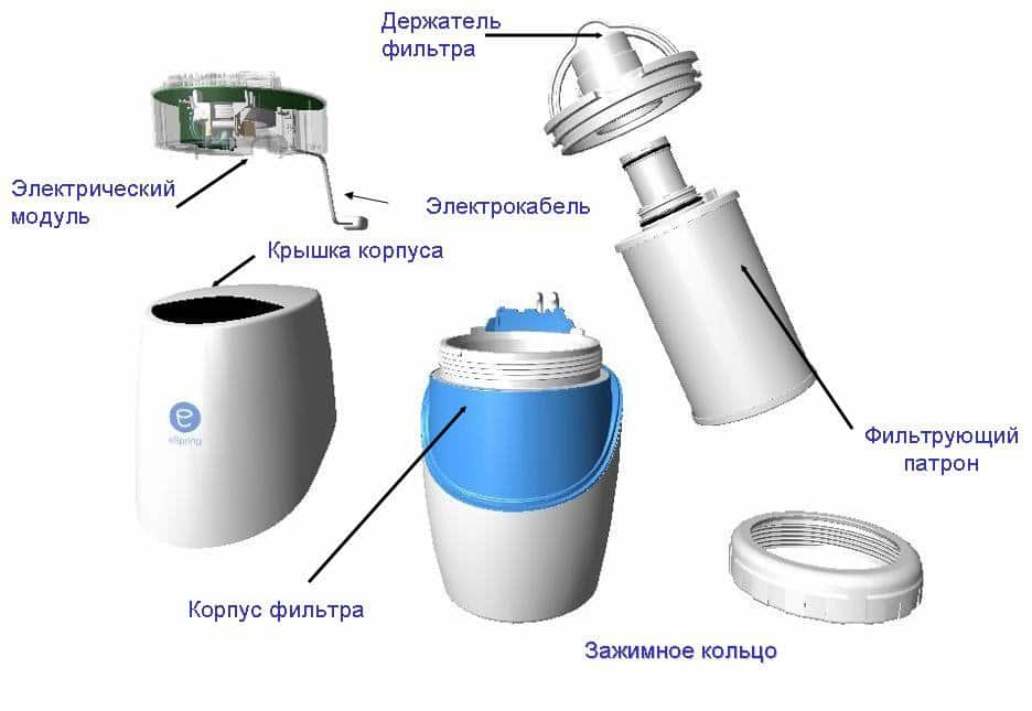 - La présence d'une lampe à ultrasons dans la composition du produit permet de se débarrasser de 99,99% des bactéries, virus et champignons présents dans l'eau du robinet.