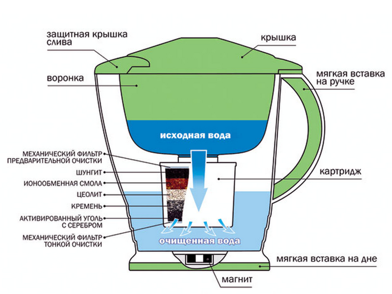 La filtration du liquide dans des cruches est généralement effectuée à l'aide d'un mélange de charbon de bois obtenu à partir de coques de noix de coco. Il est absorbant et retient les grosses particules. Les filtres ménagers peuvent également contenir des résines échangeuses d'ions. Ils résolvent parfaitement le problème de l'augmentation de la dureté de l'eau et de la présence de métaux lourds dans sa composition.