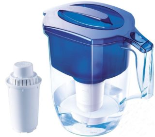 - La carafe filtrante est un plat de nettoyage en plastique peu coûteux. Un récipient plus petit est installé à l'intérieur - où l'eau est collectée - et un emplacement pour la cartouche. Le degré de purification est moyen, adapté à une faible consommation d'eau. Économique en coût. Le filtre ne protégera pas de toutes les impuretés, mais il retiendra les composés chlorés, la rouille et les particules en suspension. Il est nécessaire de choisir un appareil à cartouche tenant compte de la composition de l'eau. Les emballages indiquent les impuretés qu'il retient.