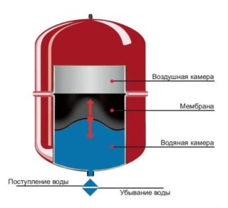 Le vase d'expansion est simple à utiliser. Le liquide de refroidissement, en expansion, pénètre dans la partie inférieure du réservoir, le remplissant. Si le volume d'eau augmente, elle appuie d'elle-même sur la membrane, repoussant celle-ci contre les parois de la deuxième partie supérieure du récipient. Par conséquent, il est très important de sélectionner avec précision le réservoir en fonction du rapport entre son volume et le volume du liquide de refroidissement situé à l'intérieur du système de chauffage d'une maison privée.