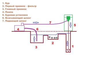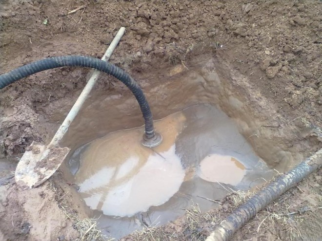 À une distance de 1 à 2 m du MBU, 2 déblais sont réalisés pour les fluides de forage avec rinçage. La fosse de filtration doit être plus proche du MBU, à une distance d'environ 1 mètre et un volume de 0,5 mètre cube. m. Un peu plus loin, vous devez creuser la fosse principale de plus grande taille. Une goulotte rectiligne les relie afin que le fluide de forage puisse s'écouler de l'un à l'autre.