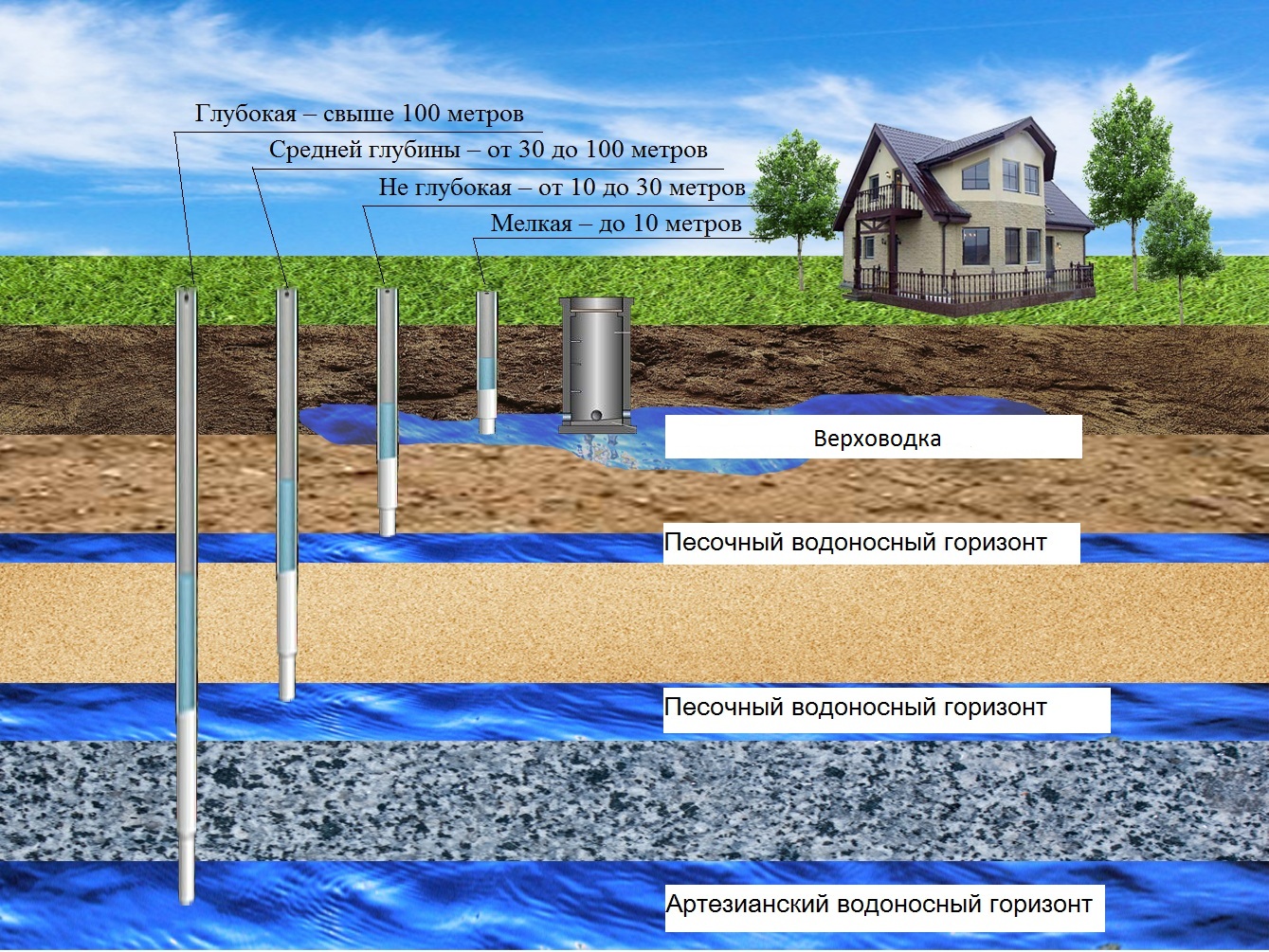 Le type de prise d'eau détermine la qualité de l'eau, la difficulté de création et la productivité du puits. Conformément à la loi russe "Sur le sous-sol", il est possible de percer un forage et d'utiliser une source de la première couche d'eau sans passer par un enregistrement spécial. Dans cette catégorie on trouve des prises d'eau de la nappe phréatique, un puits pour le sable, un puits abyssin.