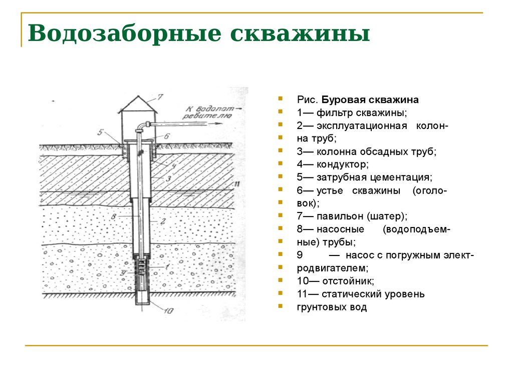 - But de la prise d'eau. Le nombre de mètres que doit avoir le puits pour l'eau est déterminé en fonction de l'utilisation du liquide. Plus la source est profonde, plus l'eau est propre.