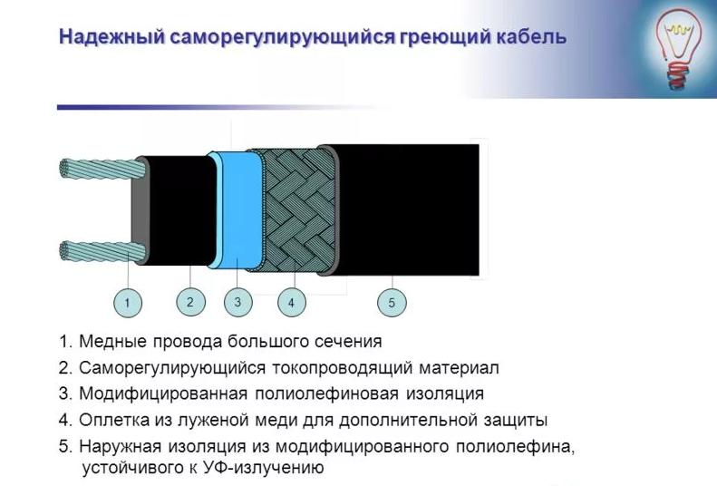 Le principe de fonctionnement d'un câble autorégulant est une température constante créée par les noyaux chauffants. Les conducteurs ne conduisent que le courant et l'élément en plastique entre eux est chauffé. Plus la température du plastique est élevée, moins le transfert de chaleur vers le tuyau est important, et vice versa, si le polymère commence à refroidir, il dégage plus de chaleur. Pendant le fonctionnement, le câble régule indépendamment la température. La durée de vie est d'environ 10 ans, mais c'est cher. Si le problème du gel du système d'alimentation en eau est aigu, il n'est pas recommandé d'économiser de l'argent, car un câble résistif moins cher n'a pas une telle ressource de travail.