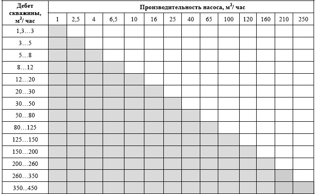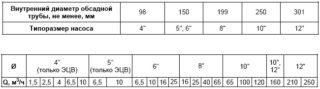 La pompe du puits doit être choisie de telle sorte que le débit du puits dépasse le débit nominal de la pompe d'au moins 25 % - Diamètre de l'arbre de puits. Cet indicateur affecte la taille de la pompe sélectionnée. Dans les sources abyssiniennes peu profondes et étroites, il n'est pas possible d'installer des pompes profondes, le liquide est soulevé par des unités de surface avec un tuyau de prise d'eau descendant dans le puits. Le diamètre des pompes centrifuges pour puits profonds standard peut atteindre 4 pouces. Conçu pour les sources d'un diamètre d'au moins 100 mm.