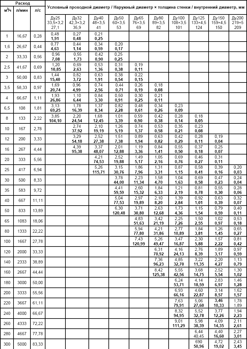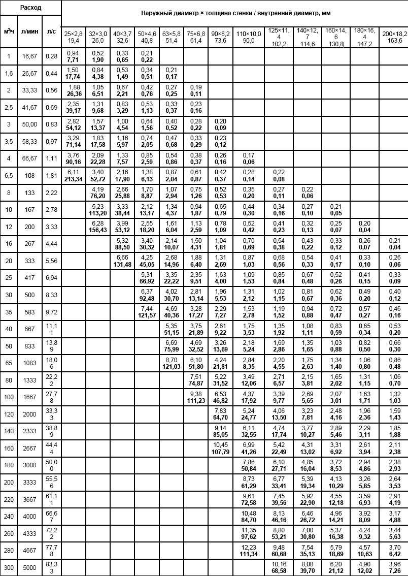 - H (pertes) - la somme des pertes dans le réseau d'alimentation en eau, est établie selon les tableaux - ces pertes sont dues au frottement du liquide contre la surface de la canalisation, ainsi qu'à la baisse de vitesse dans les sections où les tees et les coudes sont joyeux;