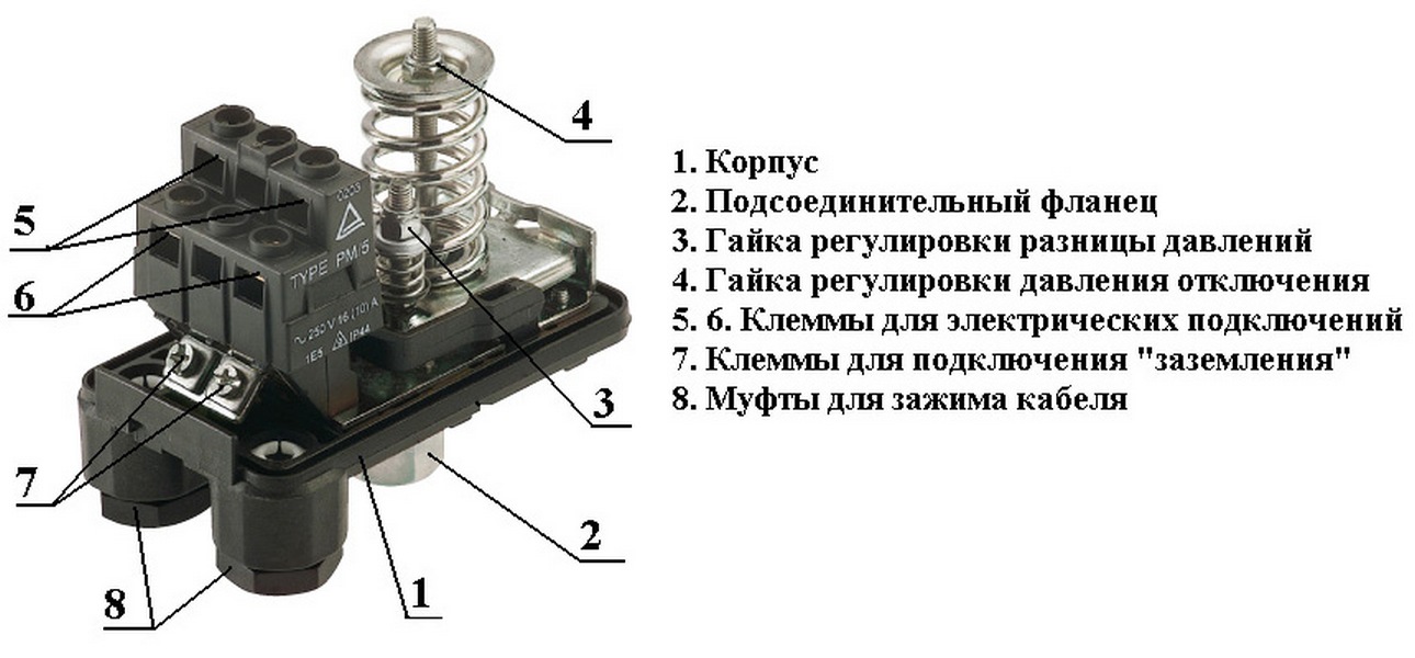 La tâche principale du relais est de contrôler les indicateurs de pression minimale et maximale dans le réservoir de stockage, afin de maintenir la différence de pression optimale lorsque la station de pompage est allumée et éteinte. La limite des valeurs admissibles dépend de la puissance et des performances de la pompe installée et du débit horaire.