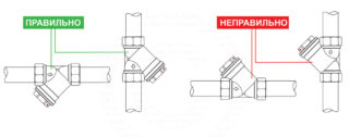 Pour que les débris collectés à l'intérieur du purificateur n'interfèrent pas le plus longtemps possible avec le mouvement de l'eau, le corps doit être orienté de manière à ce que la maille soit verticale ou inclinée, mais pas plate. Dans ce cas, l'entrée de la grille elle-même devrait être plus haute - à cause de cela, les débris s'accumulent de l'autre côté de celle-ci.