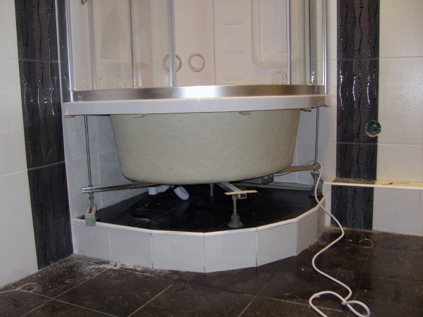 - Installez la palette. La première chose à retenir lors de l'installation d'une palette est qu'une marge de hauteur pour l'ensemble de la palette d'au moins 15 centimètres est requise. Pour que l'eau usagée s'écoule sans problème dans le drain, vous devez installer le tuyau de drainage dans l'ordre suivant : vous devez retirer les éléments du tablier ; soulever l'arrière de la palette ; un tuyau doit être posé sur le genou de vidange; Fixez la deuxième partie du tuyau dans le trou de vidange. N'oubliez pas que plus le puisard est haut au-dessus du drain, plus l'eau s'écoulera rapidement dans les tuyaux. Pour un drainage rapide, le tuyau doit être installé avec une légère pente. À l'aide d'un long niveau, vous devez placer le bas de la palette horizontalement. Choisissez un emplacement pratique en ajustant les supports spéciaux, qui doivent ensuite être fixés avec des contre-écrous. Ensuite, à l'aide des écrous de serrage, le drain est monté, reliant le siphon et la palette. Il est impératif de s'assurer qu'il y a un espace entre la cabine et le sol. Plus il est grand, plus l'eau s'écoulera rapidement.