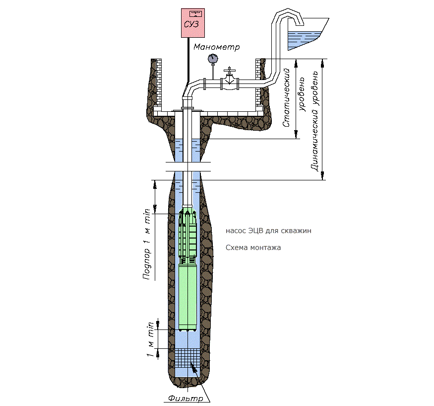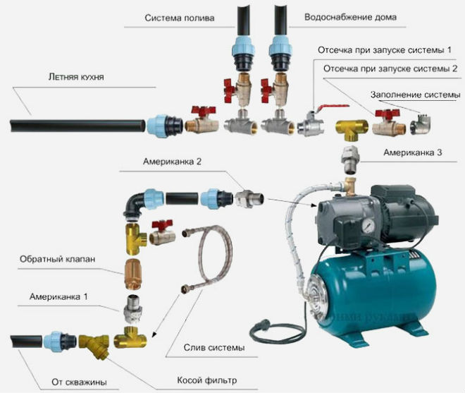 Le schéma de connexion d'une station de pompage à un puits pour une maison privée avec une pompe profonde est relativement simple. Si un adaptateur de fond est utilisé, le travail est effectué comme suit :