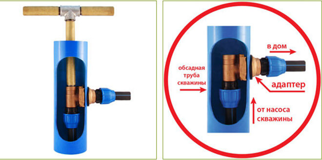 - Par l'adaptateur de forage. Il s'agit d'un dispositif, qui est une sorte d'adaptateur entre le tuyau d'admission dans le puits source et les tuyaux d'alimentation en eau à l'extérieur. Grâce à l'adaptateur de forage, il est possible de tirer la ligne hors de l'ouvrage hydraulique juste en dessous du point de congélation du sol et en même temps d'économiser sur l'installation du caisson.