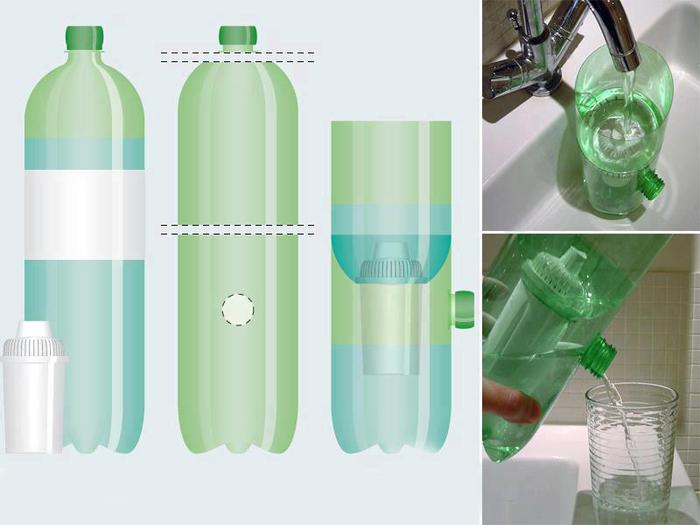 Il existe une autre option pour un filtre maison. Le rôle de la cartouche est assuré par une bouteille en plastique de deux litres remplie d'un mélange filtrant, le corps est un seau avec un couvercle. Cette méthode de nettoyage est pratique à utiliser pendant les vacances ou les randonnées, lorsque le liquide est prélevé dans l'eau libre.