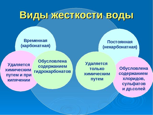 La forte concentration de sels de métaux alcalino-terreux rend l'eau dure. Il peut contenir des carbonates, des sulfates, des chlorures de magnésium et de calcium, des suspensions minérales. La quantité d'impuretés dépend du type de sol. Selon le degré de dureté, il existe trois types de liquide :