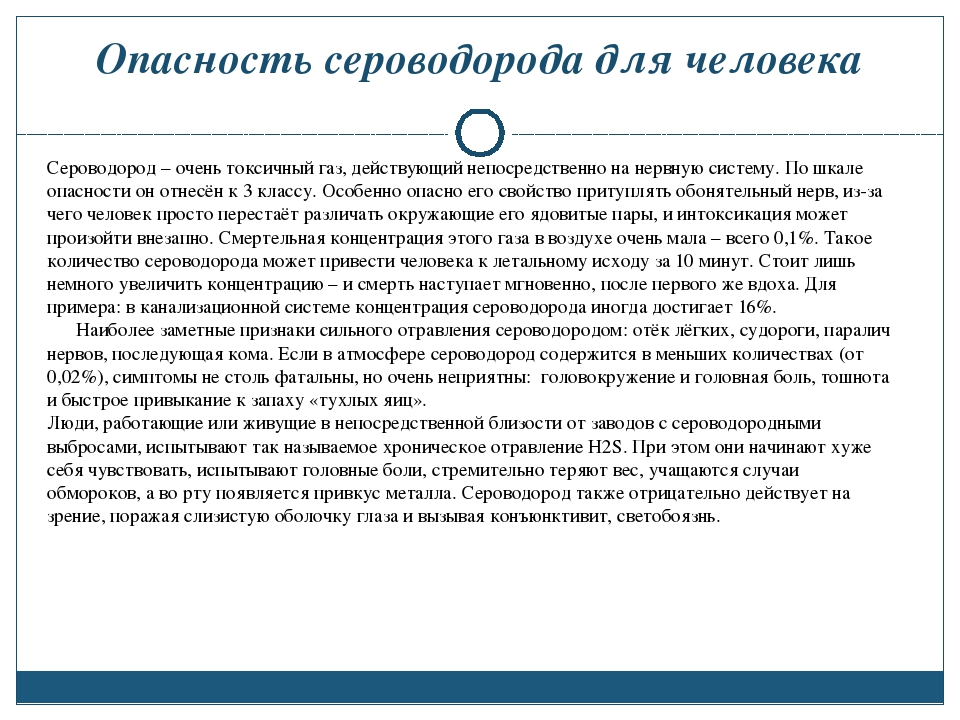 Une teneur importante en sulfure d'hydrogène dans l'air provoque une inflammation des paupières, des évanouissements et des intoxications toxiques. Peu à peu, une personne s'habitue à la puanteur et cesse de la remarquer, étant constamment exposée aux effets nocifs de la substance, ce qui finit par conduire à la maladie.
