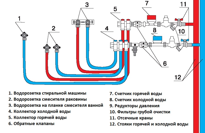 Le câblage du réseau d'alimentation en eau avec l'installation du collecteur peut se faire indépendamment. Il est assemblé selon le schéma suivant : le tuyau principal est connecté directement au peigne, sans aucune dérivation. Des tuyaux d'alimentation en eau pour chaque appareil de plomberie y sont connectés. Les appareils sont commodément montés derrière le réservoir des toilettes. Mais d'autres versions sont également valables.