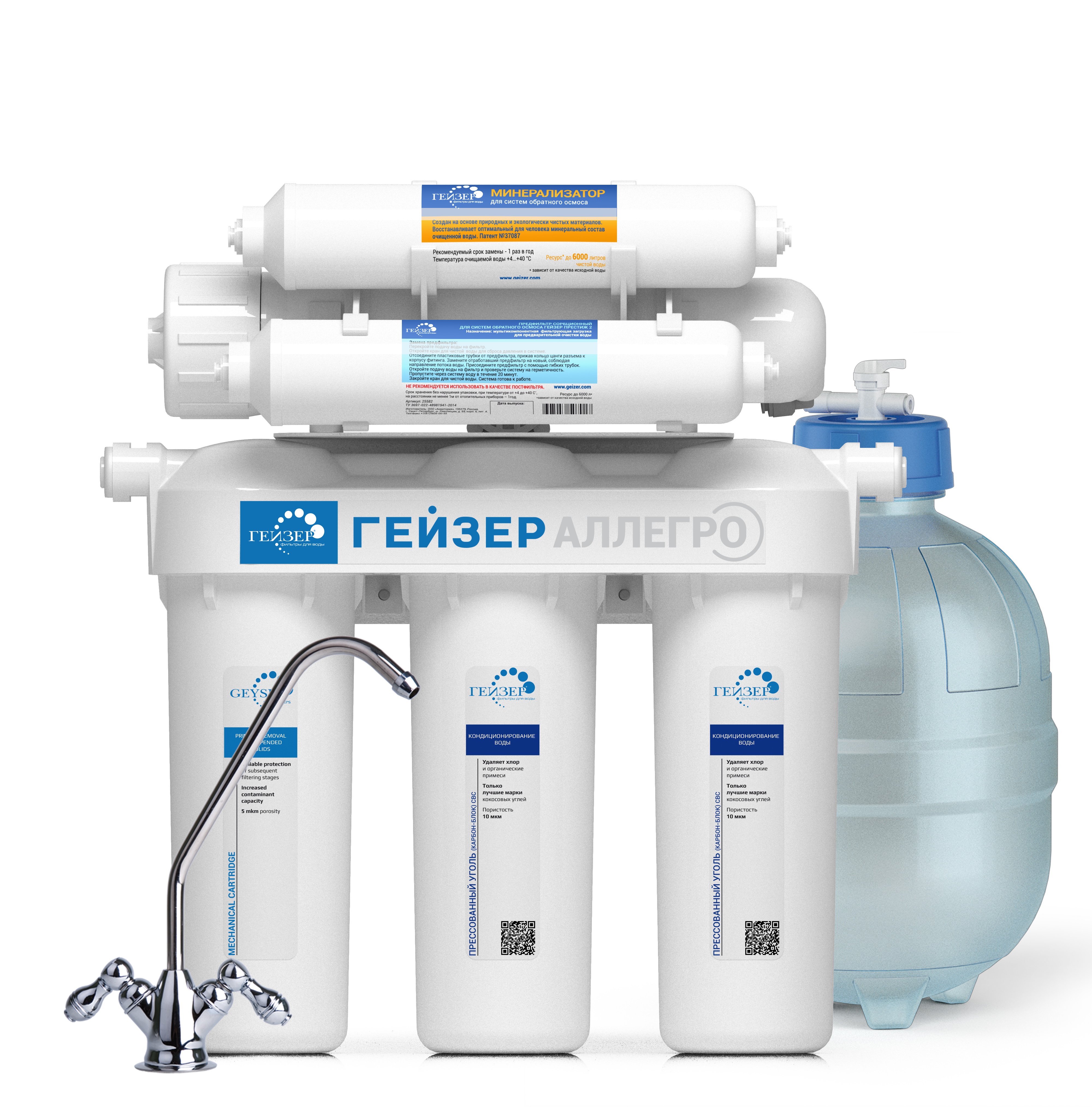 La société Geyser utilise une technologie spéciale de couche de membrane protectrice afin que la saleté filtrée ne se dépose pas dessus, mais soit complètement évacuée dans les égouts. La taille des pores est beaucoup plus fine que celle des cheveux, de sorte que la sortie est presque de l'eau distillée. La filtration se déroule en plusieurs étapes, de sorte qu'avant de traverser la membrane, le liquide est complètement nettoyé des grosses particules. Le coût du filtre est élevé, mais l'eau n'a pas besoin de purification supplémentaire.