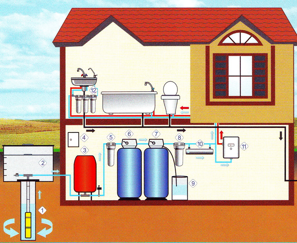 Assurez-vous d'installer un accumulateur hydraulique dans le système d'alimentation en eau autonome. Sa tâche est de créer une pression d'eau lorsque la pompe est éteinte. L'installation d'un accumulateur hydraulique, de filtres et d'autres éléments de traitement de l'eau est effectuée dans une pièce spéciale à l'intérieur de la maison. Il s'agit généralement du sous-sol ou de l'une des pièces de service du rez-de-chaussée. Toutes les connexions sont effectuées par des femmes américaines - raccords de déconnexion double face.