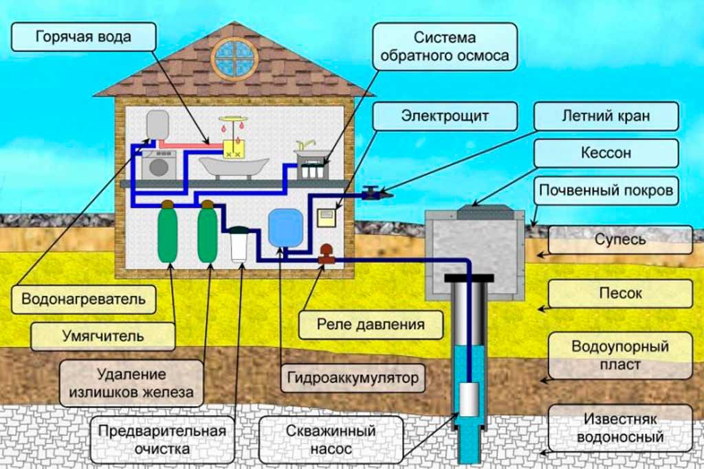 Il est plus difficile de réaliser un système d'approvisionnement en eau autonome dans le sens où il faut lui construire un puits et l'équiper selon tous les canons du métier de la construction. Habituellement, pour cela, un caisson est formé, où des vannes d'arrêt et une pompe sont installées. Un tuyau en est conduit vers la maison. Le caisson doit être fermé avec un couvercle isolé.