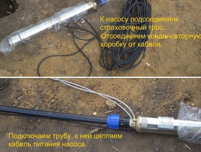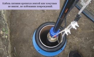 - Application d'éléments supplémentaires pendant la descente. Avec la pompe, un cordon d'alimentation et un tuyau en plastique renforcé sont abaissés dans le tube du boîtier, qui est connecté au tuyau de dérivation. Ils sont fixés avec du ruban isolant par incréments de 70 à 130 cm.Le premier paquet de ruban isolant doit être situé à 20 cm du tuyau d'évacuation.