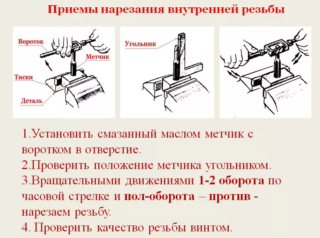 L'intérieur du tuyau doit être nettoyé et lubrifié. Le taraud est inséré verticalement, la tige est fixée dans le taraud. La rotation est dans le sens des aiguilles d'une montre. Lorsque vous travaillez avec du métal mou, l'outil est périodiquement retourné et les copeaux sont nettoyés. La graisse est nécessaire. Après la fin des travaux, la qualité du fil est vérifiée.