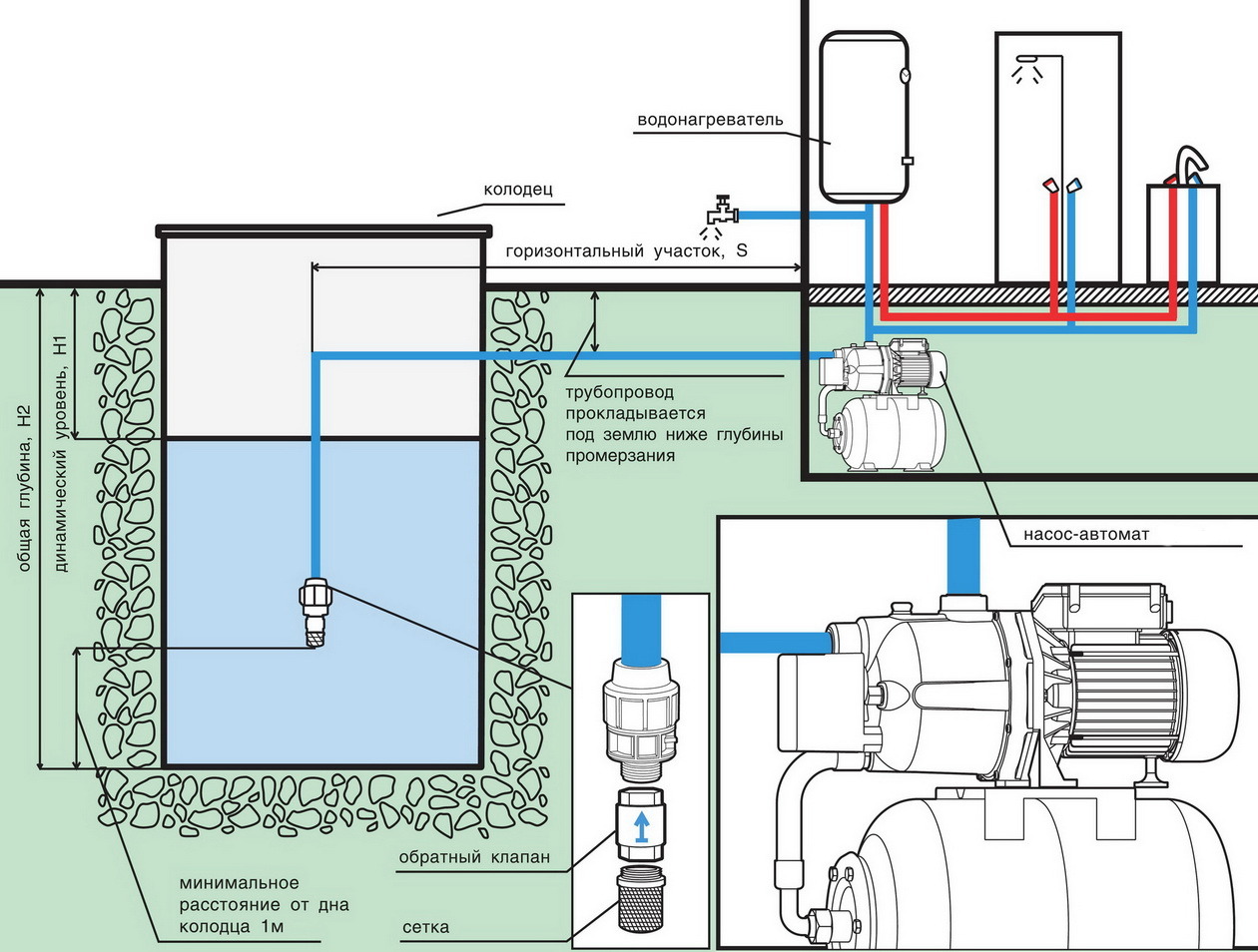 - Mettez des tuyaux et un tuyau qui seront descendus dans le puits. Un filtre est placé à l'extrémité du tuyau et un clapet anti-retour est installé.