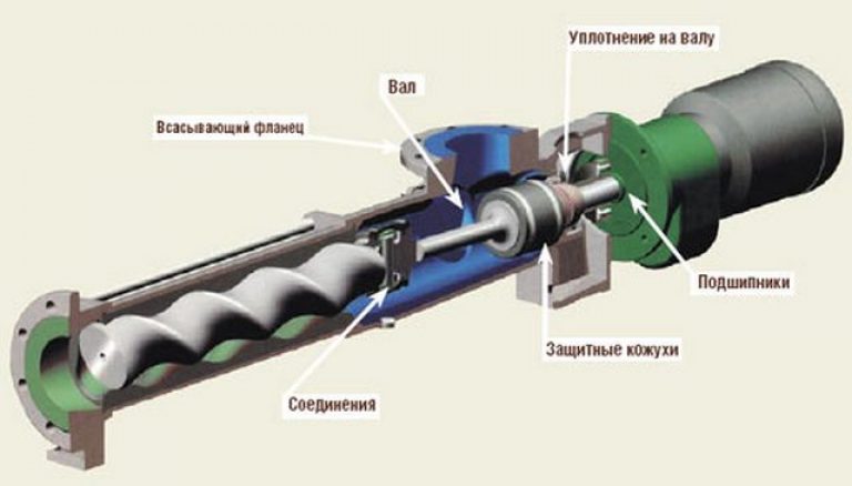 Des modèles à vis peuvent être envisagés, mais on les trouve rarement sur le marché. Ils créent une forte tête, ce qui peut être un paramètre important si le puits est situé loin de la maison. Les unités pompent bien le liquide sale et les pièces internes ne se cassent pas en même temps. Un entretien fréquent peut être nécessaire en raison de la grande quantité d'éléments frottants à l'intérieur du boîtier. Le rendement de telles pompes est bien inférieur à celui des pompes centrifuges.