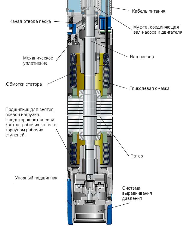 Le boîtier de la pompe submersible est complètement enterré dans le liquide, de sorte que le bruit de l'équipement d'exploitation ne sera pas gênant. L'eau froide dans le puits empêche la surchauffe de l'appareil, ce qui augmente sa durée de vie.