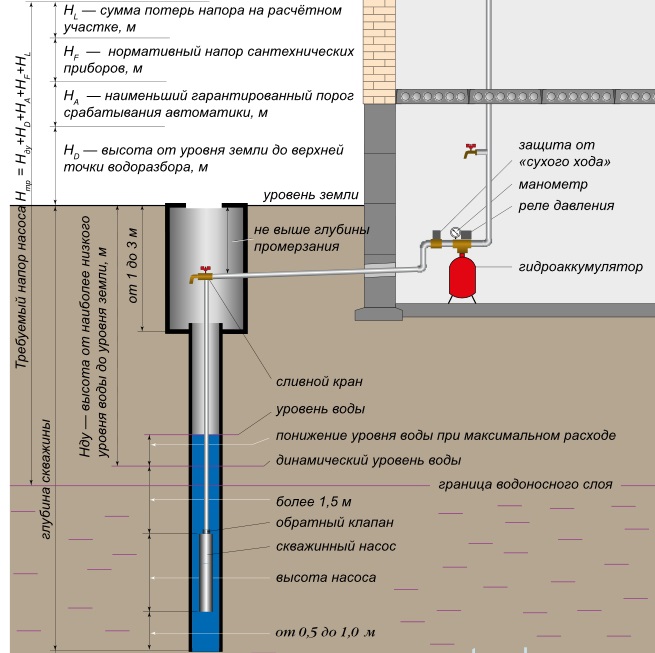 - La hauteur de la colonne d'eau est un point important si la canalisation passe horizontalement sous terre. Calculez ce paramètre par la formule en ajoutant la hauteur de levage horizontale et la longueur verticale de la ligne, divisée par 10. De plus, la pression de l'eau dans la maison doit être d'environ 2 bars.