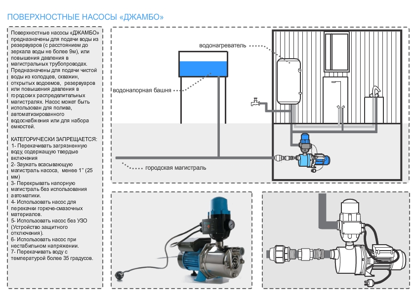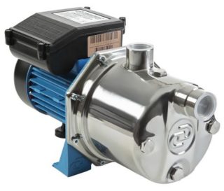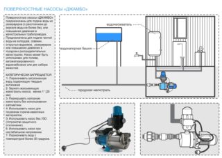 - Jumbo 60/35 H. Ce modèle a un corps en fonte. La pompe est également équipée d'un pressostat, d'un manomètre et d'un hydroaccumulateur de 24 litres. L'unité pompe 60 litres/min à une hauteur de chute de 35 mètres. La pompe peut transporter des fluides avec de petites impuretés jusqu'à 0,8 mm. La profondeur de la prise de liquide est de 9 mètres. Consommation électrique 600 watts. La température maximale de l'eau pompée est de +50 degrés.