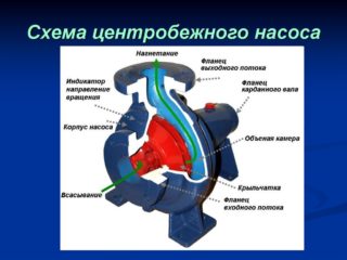 Centrifuge les unités ont une enveloppe en spirale, à l'intérieur de laquelle est fixée une roue à aubes. Lorsque la pompe est entraînée, une force centrifuge est générée. Un espace raréfié apparaît au centre, et une zone de haute pression sur les côtés, qui pousse le liquide dans le tuyau. Selon le nombre de turbines présentes sur l'unité, elle est appelée à un étage ou à plusieurs étages. La pompe à plusieurs étages de surface est plus efficace et puissante.