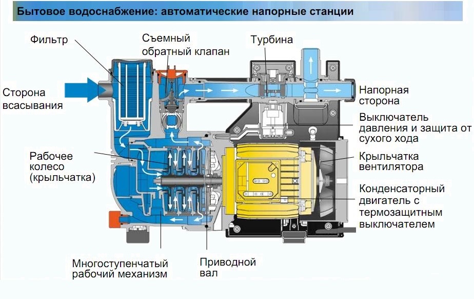 Le principe général de fonctionnement est le rapport entre la pression à l'intérieur de la station et le niveau d'eau dans le réservoir hydraulique. Lorsque le robinet est ouvert, la pression chute, provoquant l'écoulement de l'eau. Lorsque les valeurs minimales sont atteintes, les contacts sont fermés et la pompe est mise en marche. Lorsque le robinet se ferme, l'eau commence à s'écouler dans le réservoir hydraulique et lorsque la pression atteint les valeurs les plus élevées, la pompe s'arrête après l'ouverture des contacts.