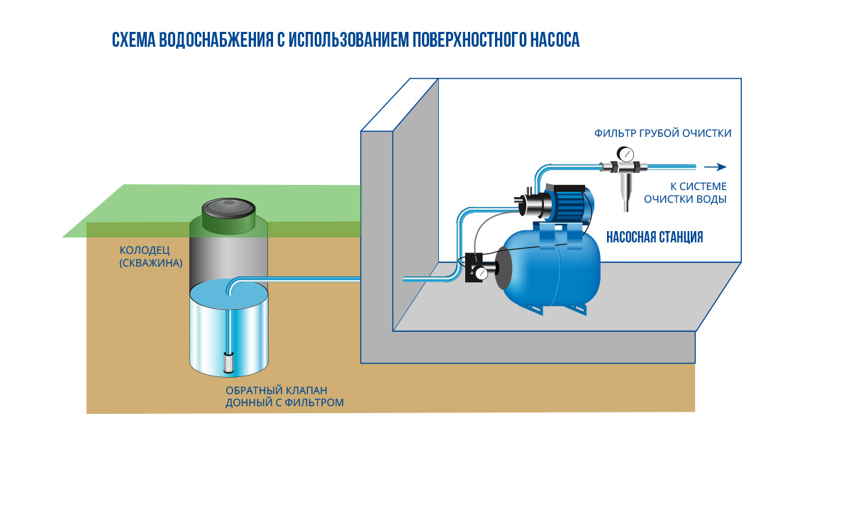 - Type de source de prise d'eau : de surface et submersible. Dans les modèles de surface, l'équipement est au-dessus du sol et le tuyau est descendu dans le puits. Le deuxième type implique l'immersion complète de l'équipement dans un puits ou un forage.