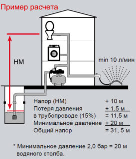 La levée maximale indique à quel étage l'eau peut être pompée. L'éloignement de la maison de la gare est important. Tous les 10 m de la section horizontale correspond à une élévation de 1 m de la surface. Si la distance est de 100 m et la hauteur de la maison de 10 m, la productivité est calculée par la formule : 100 : 10 + 10 = 20 m de colonne d'eau ou 2 atm.