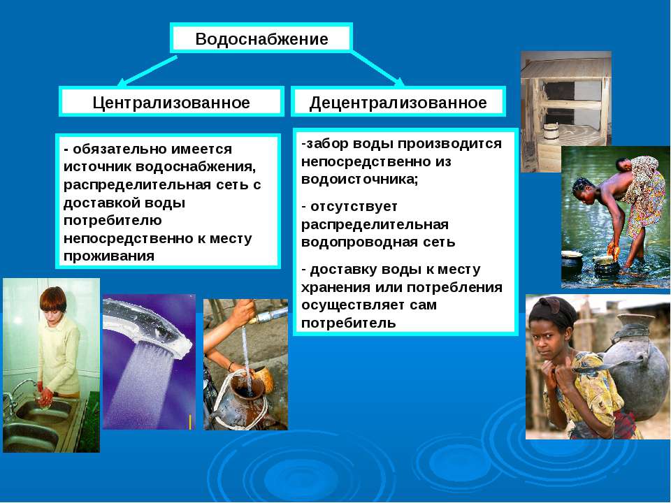 La liste des éléments indique une différence fondamentale entre les modes d'approvisionnement en eau de la population. L'approvisionnement en eau dans les zones rurales ne dispose pas de complexes de traitement d'eau, de stations de distribution et de réseaux principaux. Le rôle des réservoirs d'eau propre est repris par des navires domestiques, dans lesquels l'eau apportée est versée.