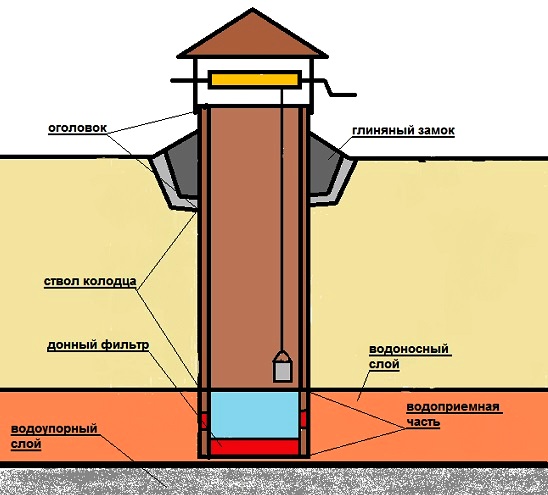 Les aquifères peuvent être situés à différentes profondeurs. S'ils sont près de la surface, ils creusent un puits, qui recueille le liquide qui est passé à travers un filtre naturel à partir de roches sédimentaires. L'arbre peut être rond ou carré.