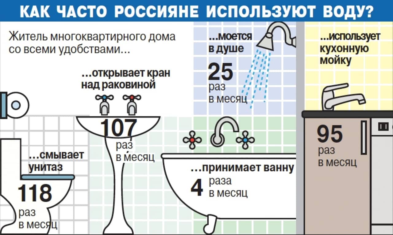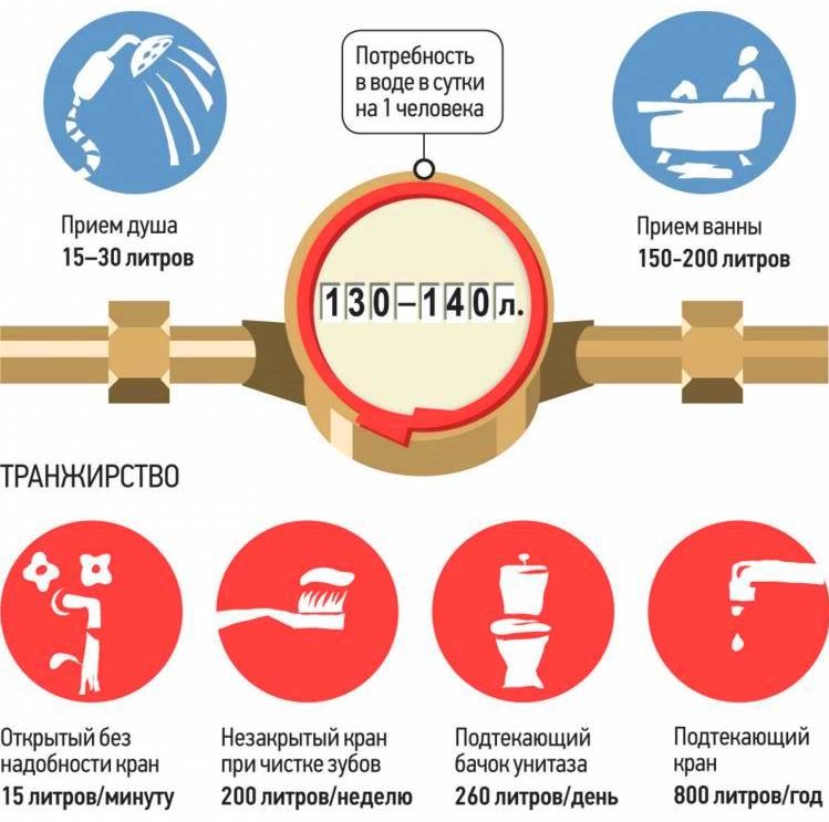 Si vous pensez qu'en installant des compteurs, vous devrez réduire la consommation d'eau, ce n'est pas le cas. Il suffit de vérifier tous les points de sortie d'eau, par exemple les mélangeurs pour détecter les fuites, afin que l'eau ne s'écoule pas gaspillée.Même avec un lavage, un nettoyage et un bain quotidiens, il est peu probable que vous dépassiez le volume standard.