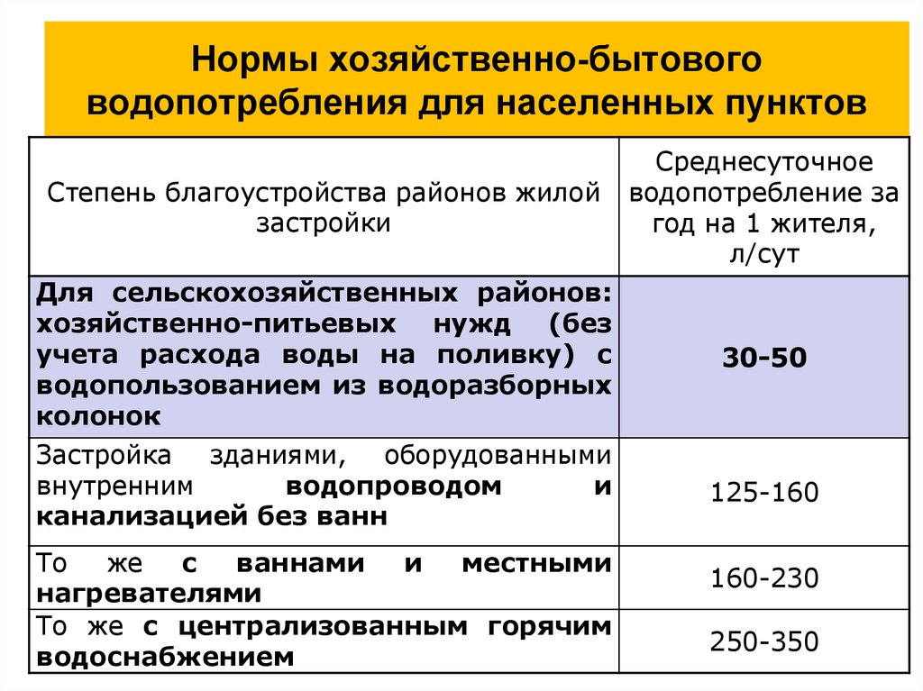 Les experts analysent non seulement le volume quotidien d'eau réellement consommée, mais aussi le coefficient sanitaire, qui dépend de l'état de l'environnement, ainsi que le volume du sous-sol. Le calcul de la consommation d'eau domestique comprend également les frais de nettoyage, d'arrosage du jardin, du potager. Par conséquent, les normes pour les maisons privées sont généralement légèrement surestimées, contrairement aux immeubles d'habitation, et il est avantageux pour leurs propriétaires d'installer des compteurs d'eau.