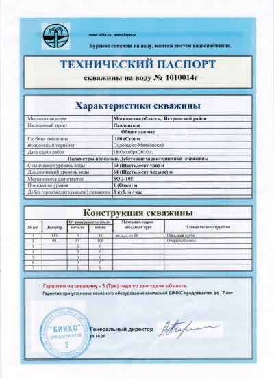 Chaque source doit avoir son propre passeport technique, où sont enregistrés tous ses paramètres et données de réglage, qui ont été transférés par les propriétaires au stade de la construction d'un puits artésien au Département de surveillance de l'utilisation du sous-sol de la Fédération de Russie. Certains puits ont des restrictions - les propriétaires peuvent utiliser des volumes limités. Le paiement d'un puits d'eau sur votre site est obligatoire si la source présente les caractéristiques techniques suivantes :