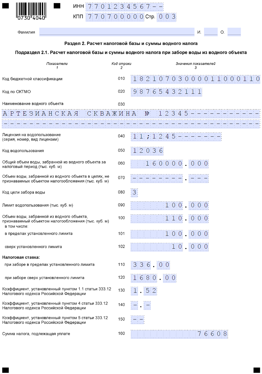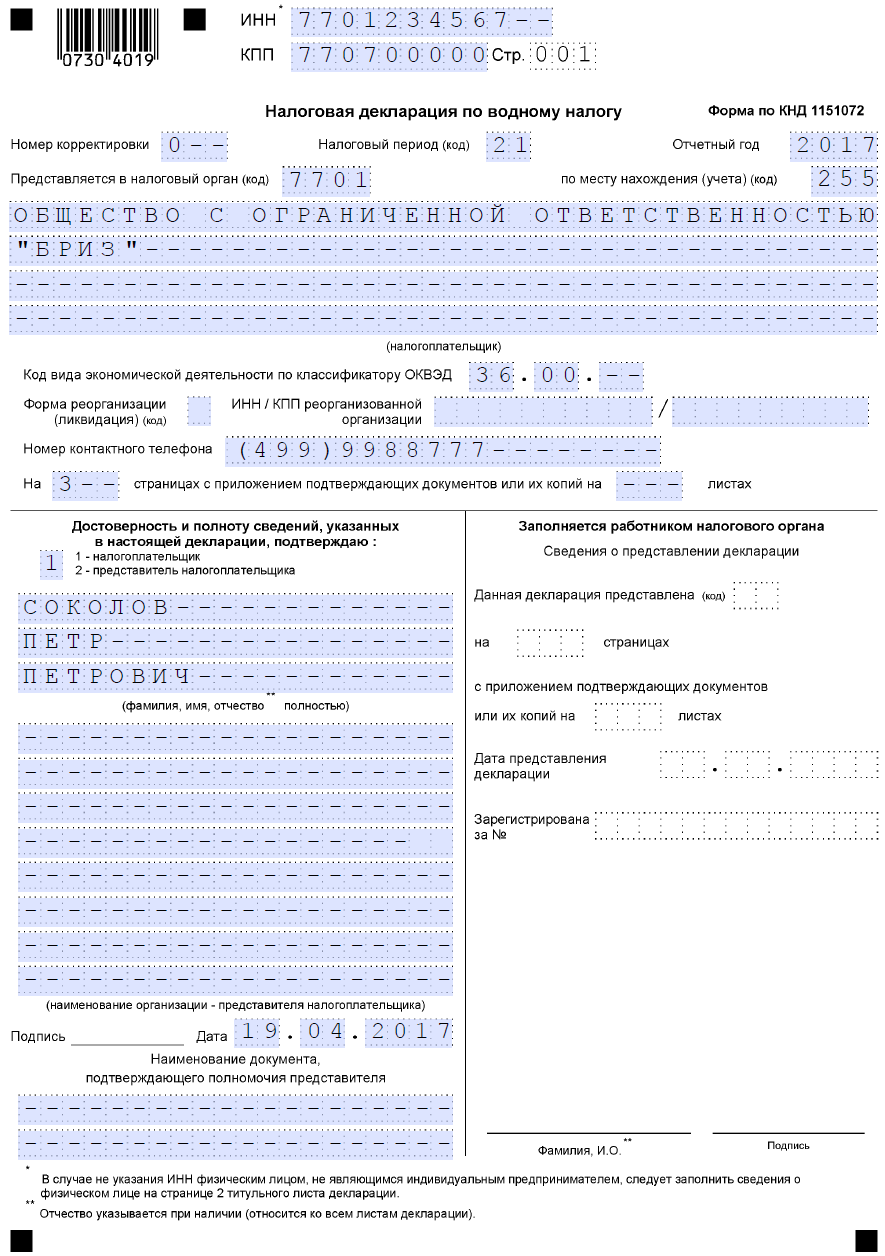 Les contribuables doivent soumettre une déclaration de revenus dans le cadre de la page de titre, section 1 et sections 2, 2.1 - 2.4 (basée sur les types possibles d'utilisation de l'eau qui sont taxables dans la Fédération de Russie).