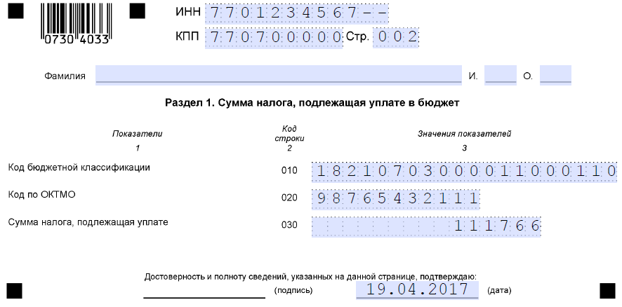 Ensuite, la déclaration fiscale elle-même est préparée, qui se compose d'une page de titre et de plusieurs sections, où les informations suivantes sont enregistrées :